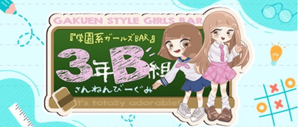 3-Nen B-Gumi Honmachi School is a girls bar located in Chuo Ward. With a school concept, sometimes everyone serves in school uniforms. The cast members get along well, and you’ll feel healed seeing young and cute girls having fun together.