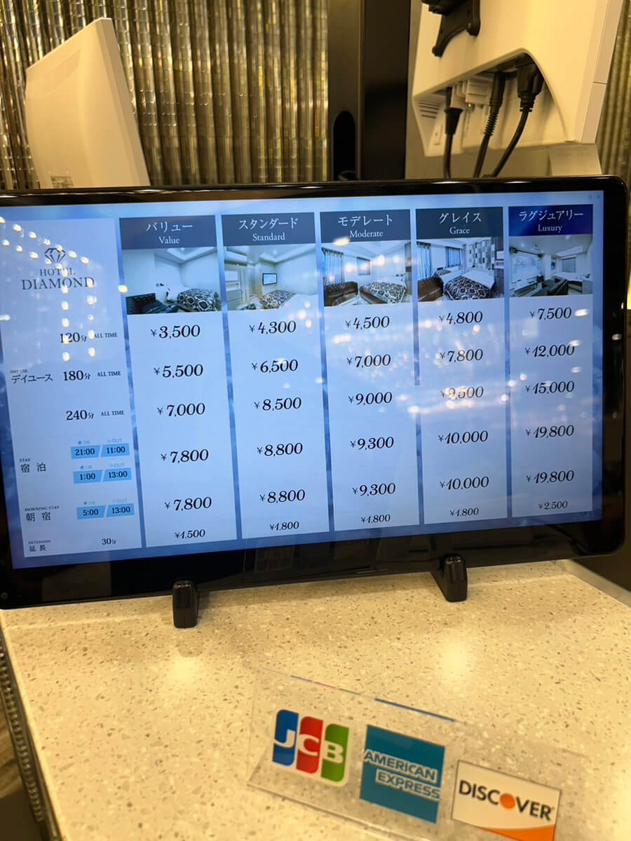 The love hotel I used this time was “Hotel Diamond”. It is located just a minute’s walk from Tokyo Sexy Milf and is easy to find with its large sign.