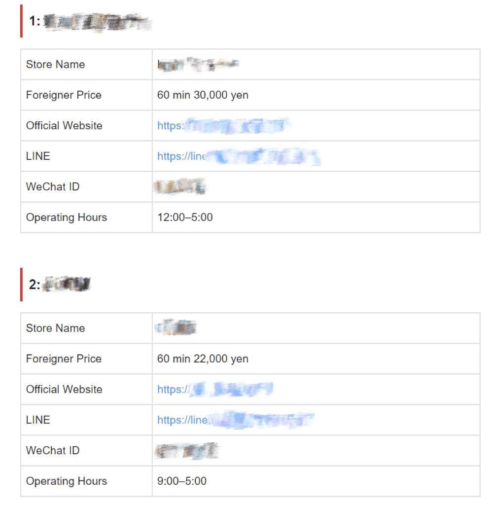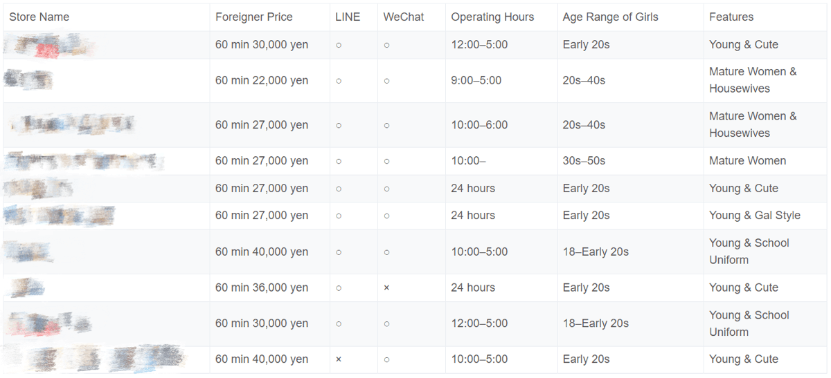 • Foreigners’ prices, operating hours, age range of the girls, official websites (some establishments may not have official websites)