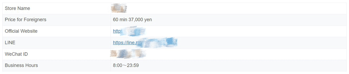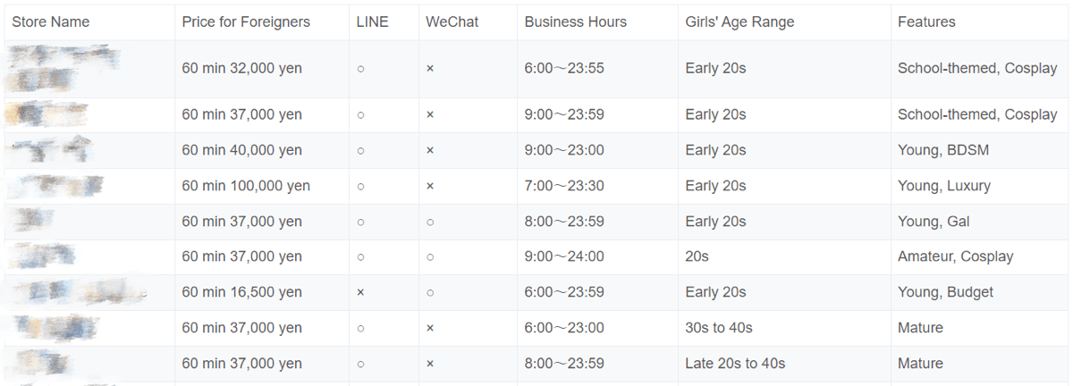 • Foreigners’ prices, operating hours, age range of the girls, official websites (some establishments may not have official websites)