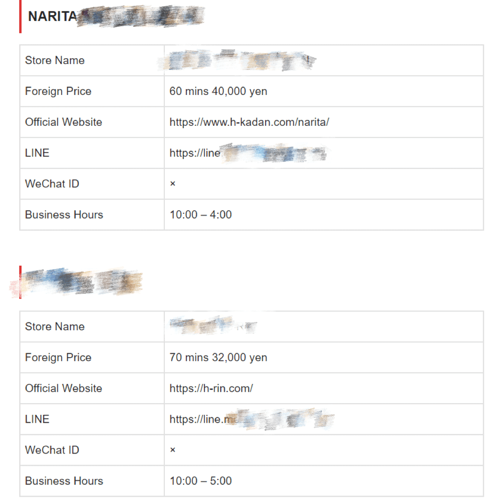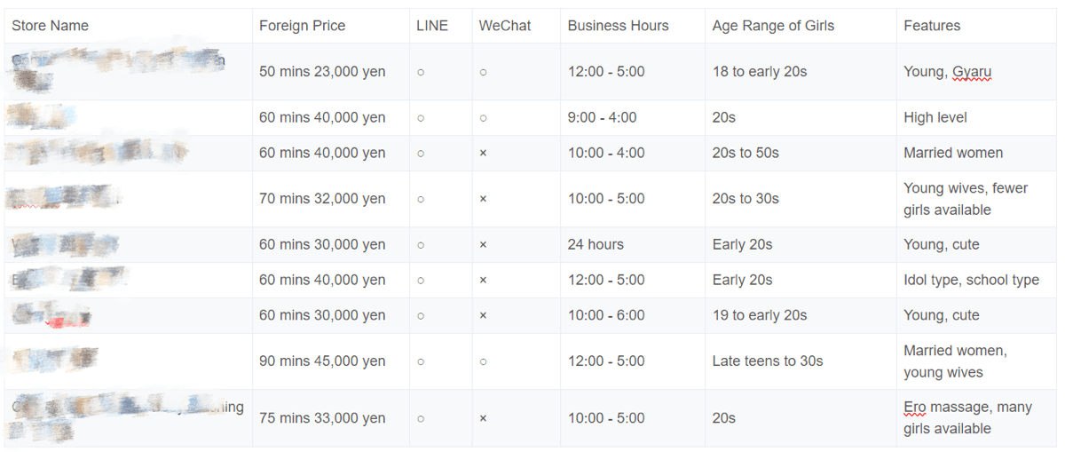 • Foreigners’ prices, operating hours, age range of the girls, official websites (some establishments may not have official websites)