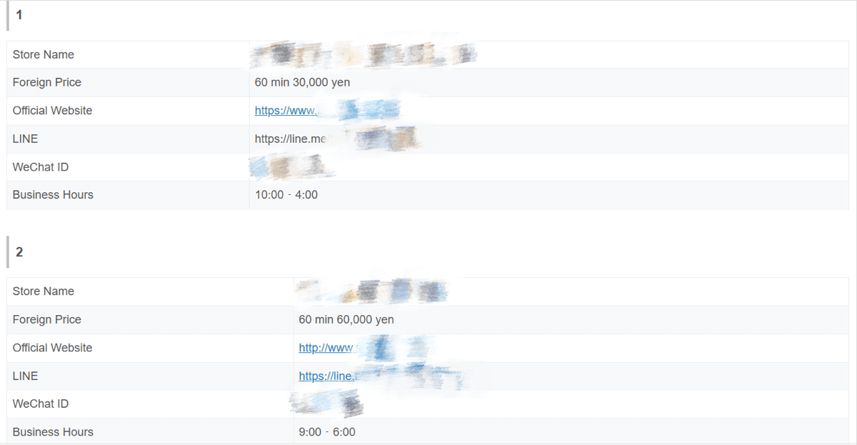 • Foreigners’ prices, operating hours, age range of the girls, official websites (some establishments may not have official websites)