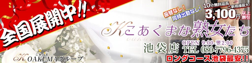 KOAKUMANAJUKUJOTACHI IKEBUKUROTEN is an escort service with approximately 60 mature women in their 30s to 60s.The price is a very reasonable 9,989 yen for 60 minutes, which is approximately 7,000 yen cheaper than the area average.