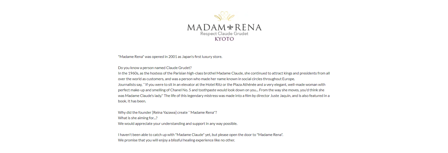 Madam Reina Kyoto offers a luxury escort service priced at 80,000 yen for a 90-minute session. The high cost is justified by setting the play fee at twice the usual market rate. Moreover, the women on staff uphold the quality befitting such a price.