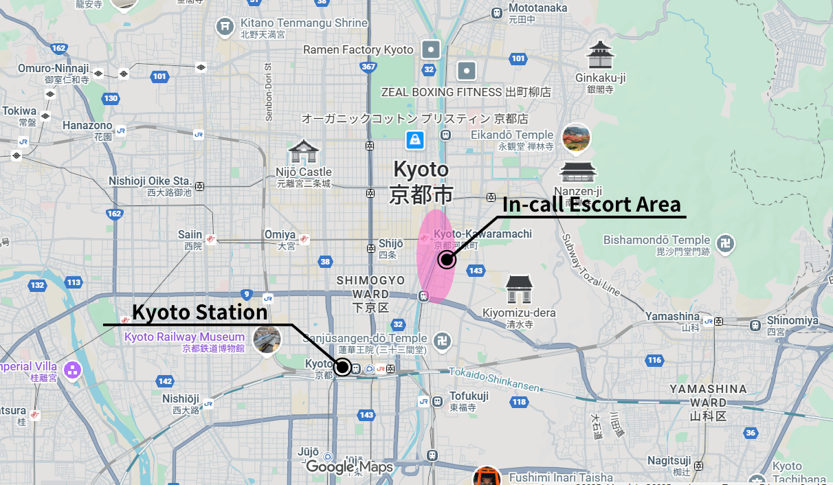 *The pink-highlighted area indicates the incall escort district in Kawaramachi.